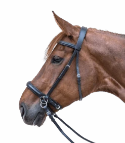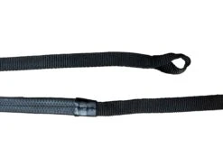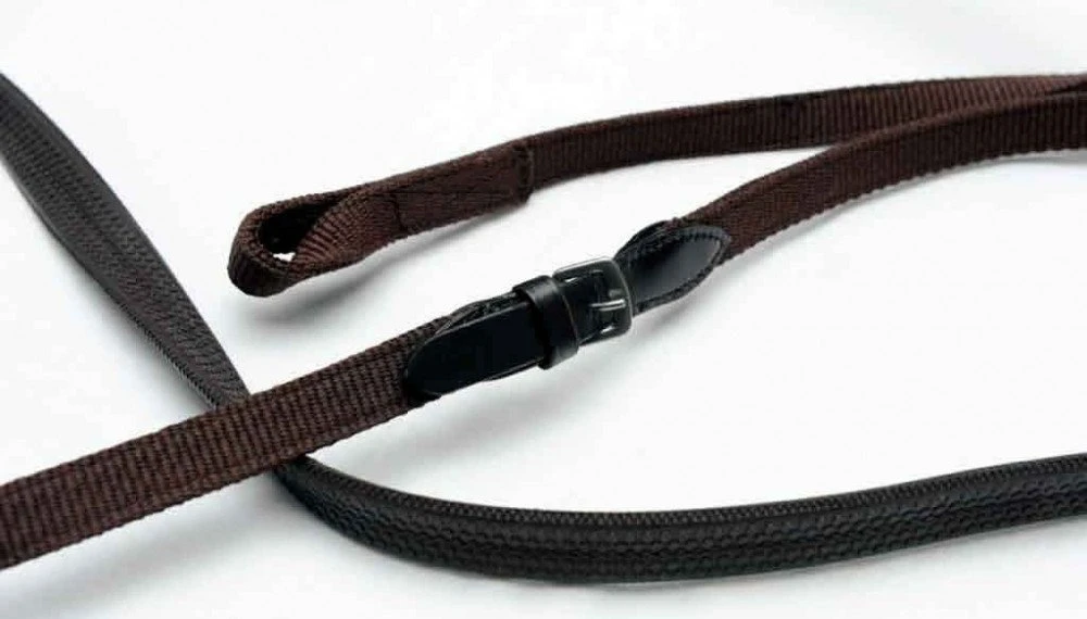 Strong and practical loop end nylon reins with leather buckle at rider end for safety.