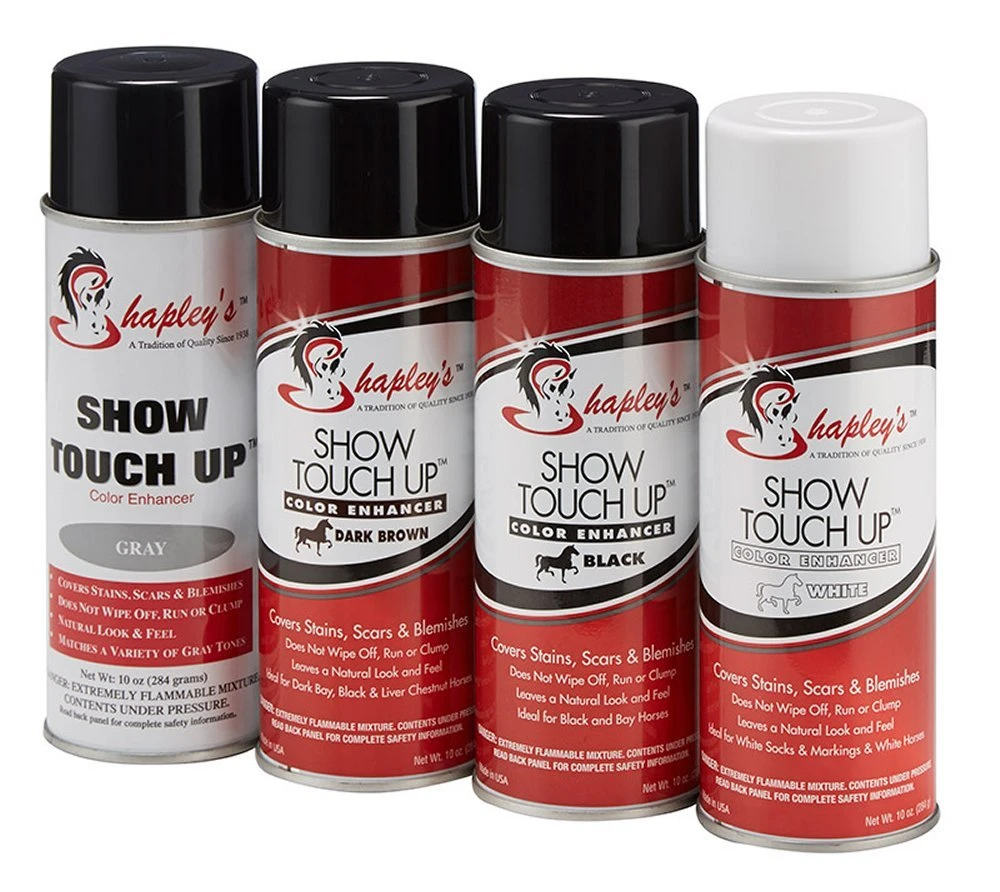 Show Touch Ups were created exclusively by Shapley’s specifically for horses. This incredible product covers stains, scars, blemishes and flaws on your horse’s coat. It can also be sprayed in tails to create a fuller appearance. Show Touch Ups are a must have for any horse competing or whenever you want to improve the appearance of your horse.