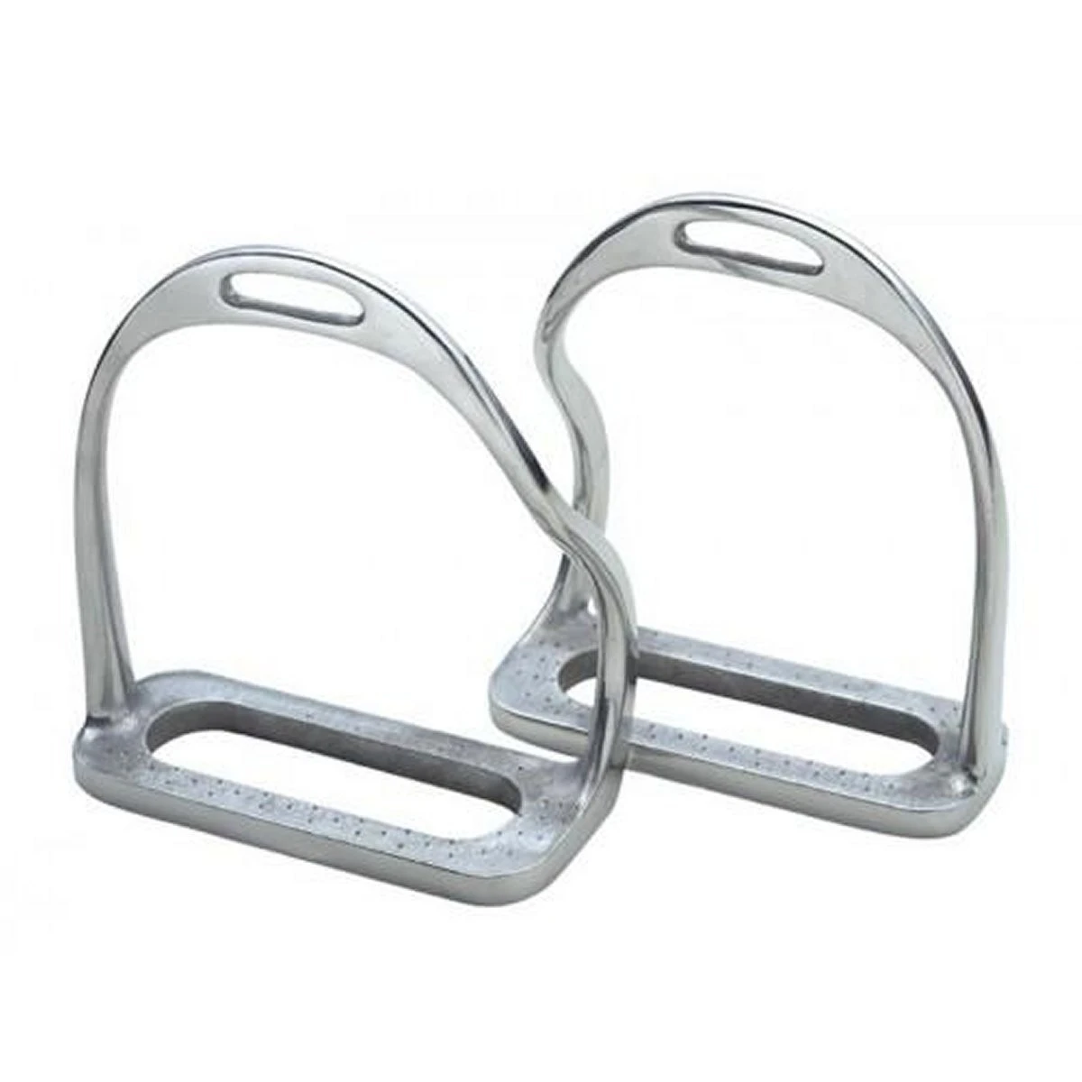 Bent leg stirrup irons are specially shaped to help prevent the foot becoming caught in the stirrup