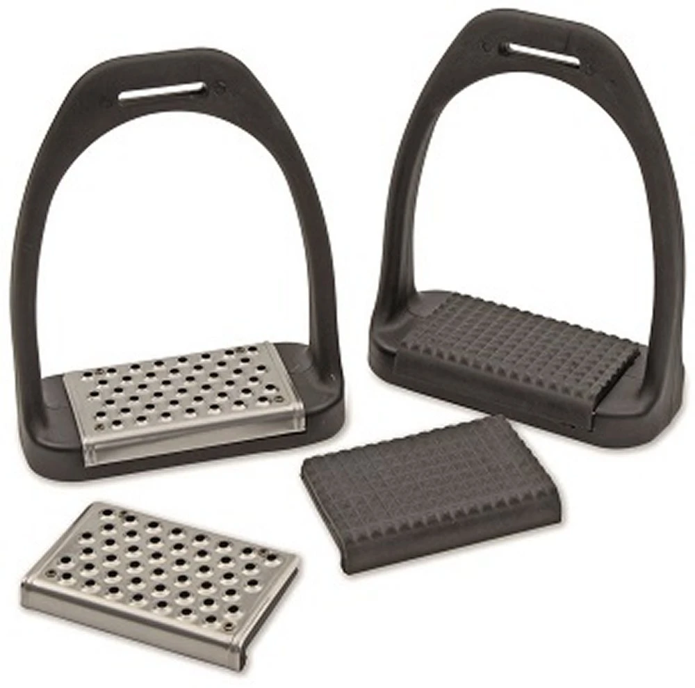 These versatile lightweight stirrups benefit from having the option of two treads: rubber grip for general purpose use and metal cheese grater effect for when extra grip is required. Ideal for long distance riding and general purpose alike. Treads are fixed with two secure screws