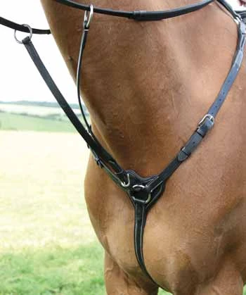 Salisbury quality leather three point breastplate with feature stitching detail to coordinate with the Salisbury leatherwork range. Complete with removable martingale attachment. It benefits from being adjustable at the shoulders and padded at the wither. The shoulder strap features elastic inserts to allow some give