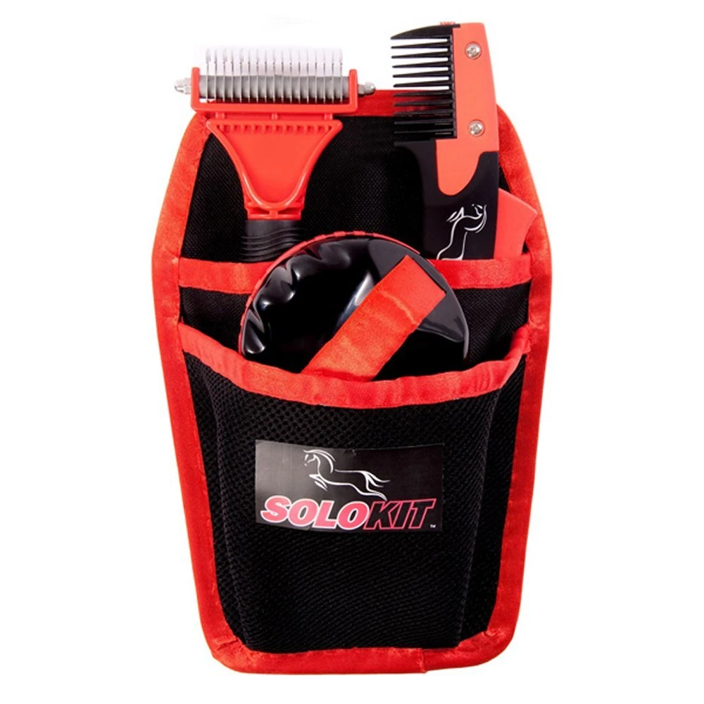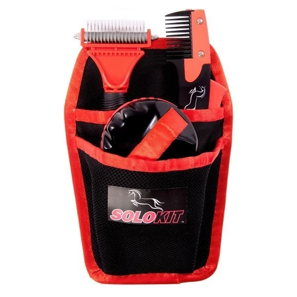 A holster containing the SoloComb, SoloRake and SoloBrush. This simple, distinctive, light clip-on holster can sit in a grooming kit then slip on to a waistband, belt or pocket, enabling the owner to work on the horse or pet without the need of bending to change tool or losing kit whilst working. Purposely designed to carry the Solo range and keep them together
