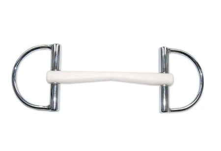 The Herm Sprenger Duo D-ring Mullen Mouth Snaffle bit is an ideal option for horses who are not comfortable in traditional bits. Made of food-safe, solvent free, soft and flexible plastic reinforced with an inner steel cable, the Duo bit follows the shape of the horse’s mouth better than traditional metal bits and is better accepted by many. The Duo has a different shape top and bottom and can be used right-side up or upside down to produce a different feeling in the horse’s mouth. One side is a straight-edged flexible bar. The other side has an indentation to leave space for the horse’s tongue.