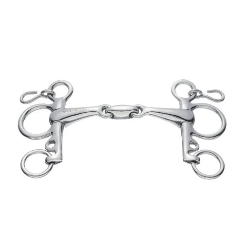 When the horse opposes the riders hand the more intensive rigid effect occurs.The Pelham is a bit that provides additional lever action on the poll.Pressure is applied to the lower jaw bones by the use of a curb chain. In a way the Pelham is a combination of a Weymouth and a bradoon. Pelhams can be used with one or two reins, which enables different rein options.